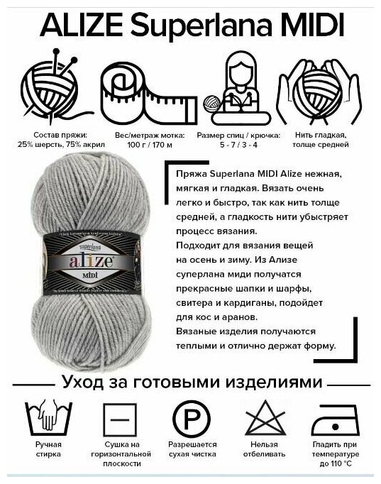 Пряжа ALIZE SUPERLANA MIDI, серый - 87, 25% шерсть, 75% акрил, 5 мотков, 100 г, 170 м.