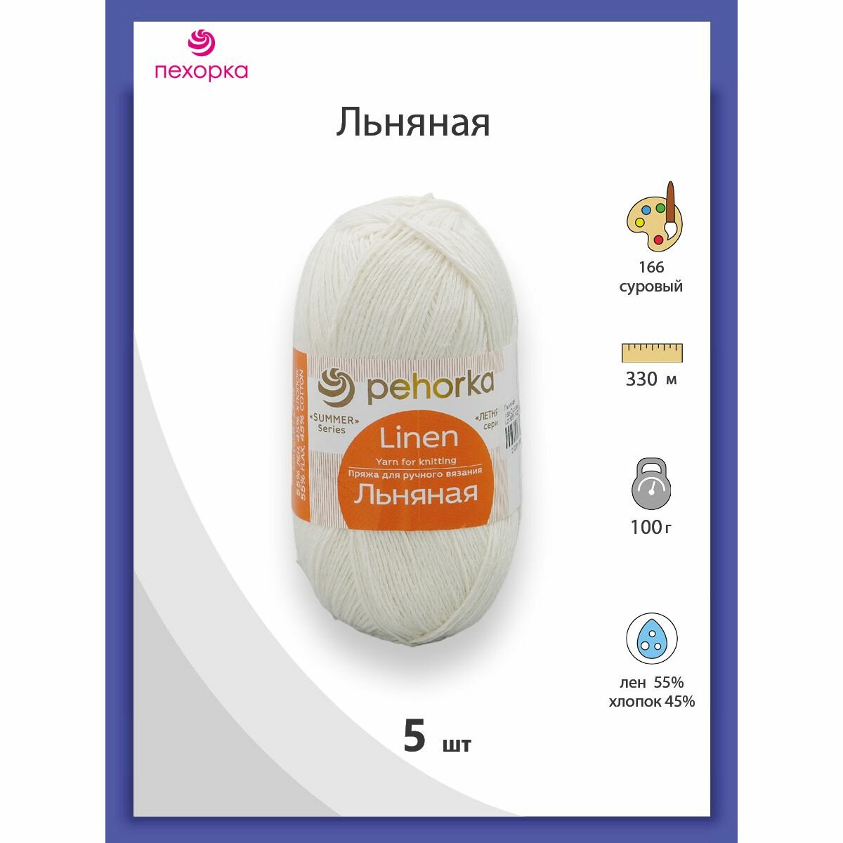 Купить Пряжа Пехорка "Льняная", 100 гр 330 м, лен 55%, 45% хлопок, 166 суровый, 5 шт