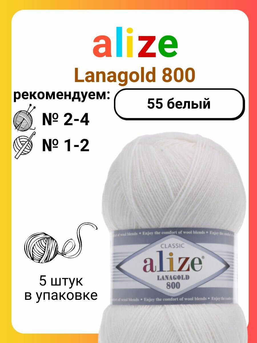 Пряжа ALIZE LANAGOLD 800, белый - 55, 49% шерсть, 51% акрил, 5 мотков, 100 г, 730 м.