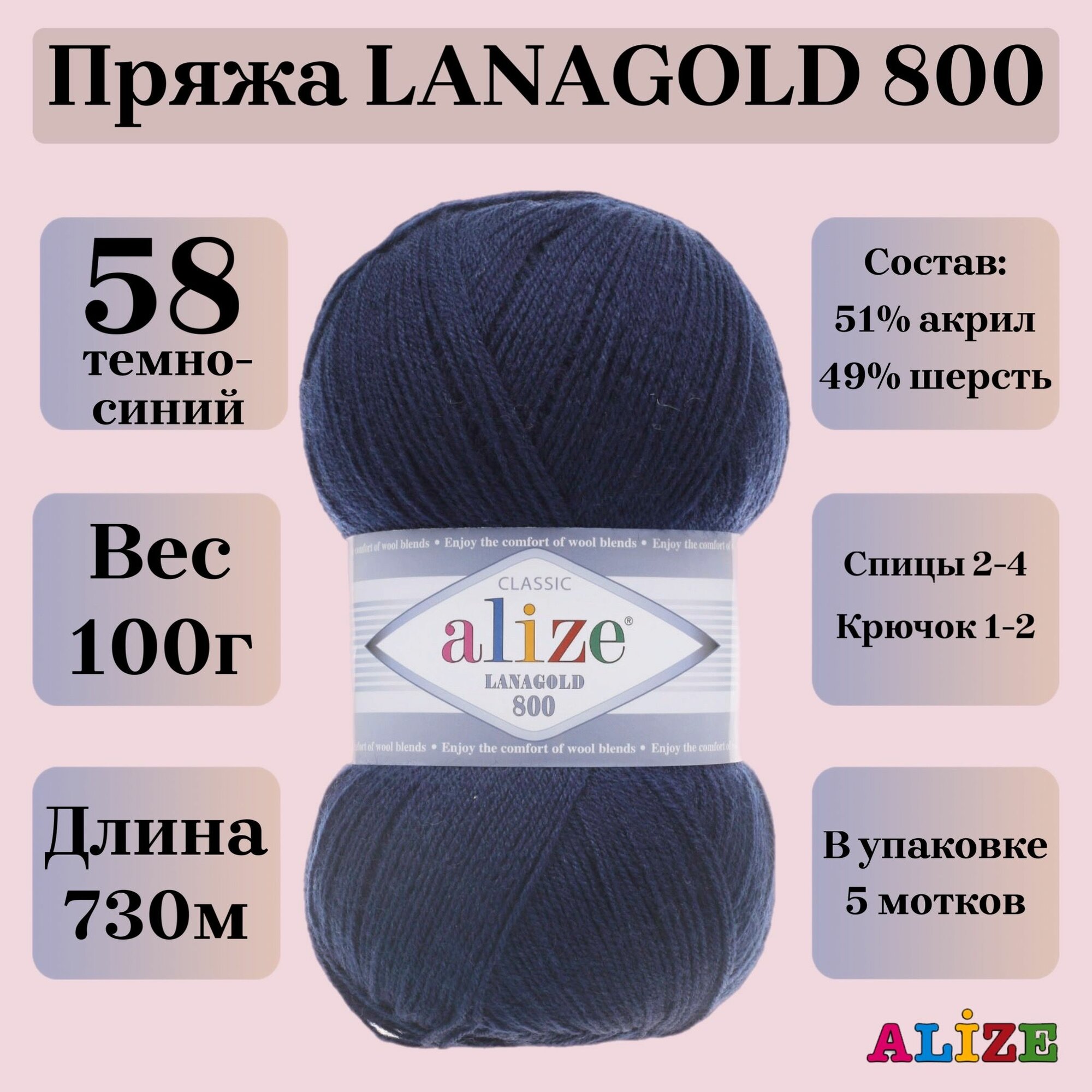 Купить Пряжа для вязания ALIZE 'Lanagold 800', 100г, 730м (49% шерсть, 51% акрил) (58 темно-синий), 5 мотков