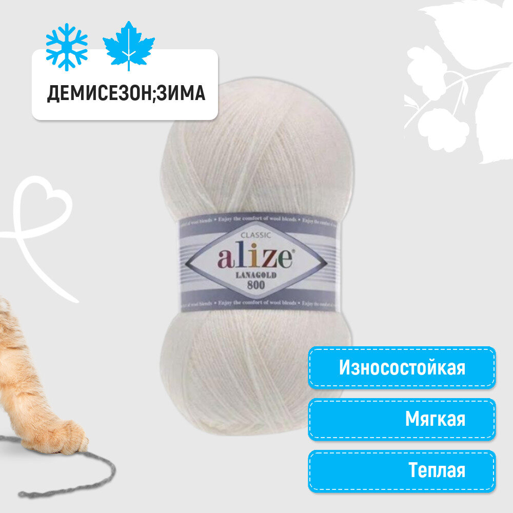 Пряжа Alize Lanagold 800 молочный (62), 51%акрил/49%шерсть, 800м, 100г, 1шт