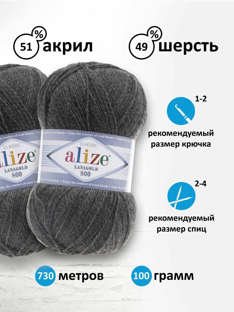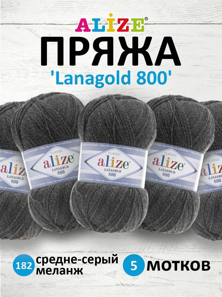 Пряжа ALIZE LANAGOLD 800, средне-серый - 182, 49% шерсть, 51% акрил, 5 мотков, 100 г, 730 м.