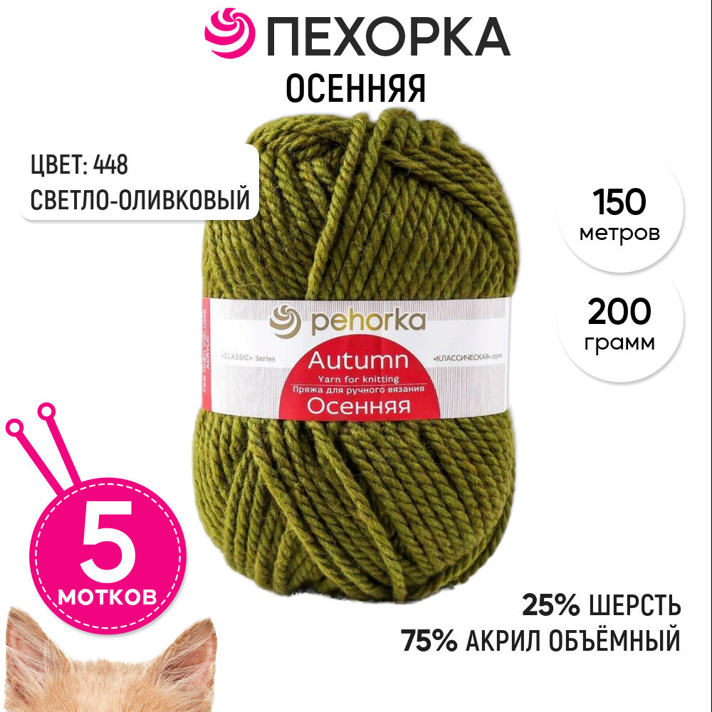 Пряжа Осенняя (Пехорка), Св. оливковый - 448, 25% шерсть, 75% акрил, 5 мотков, 200 г, 150 м.