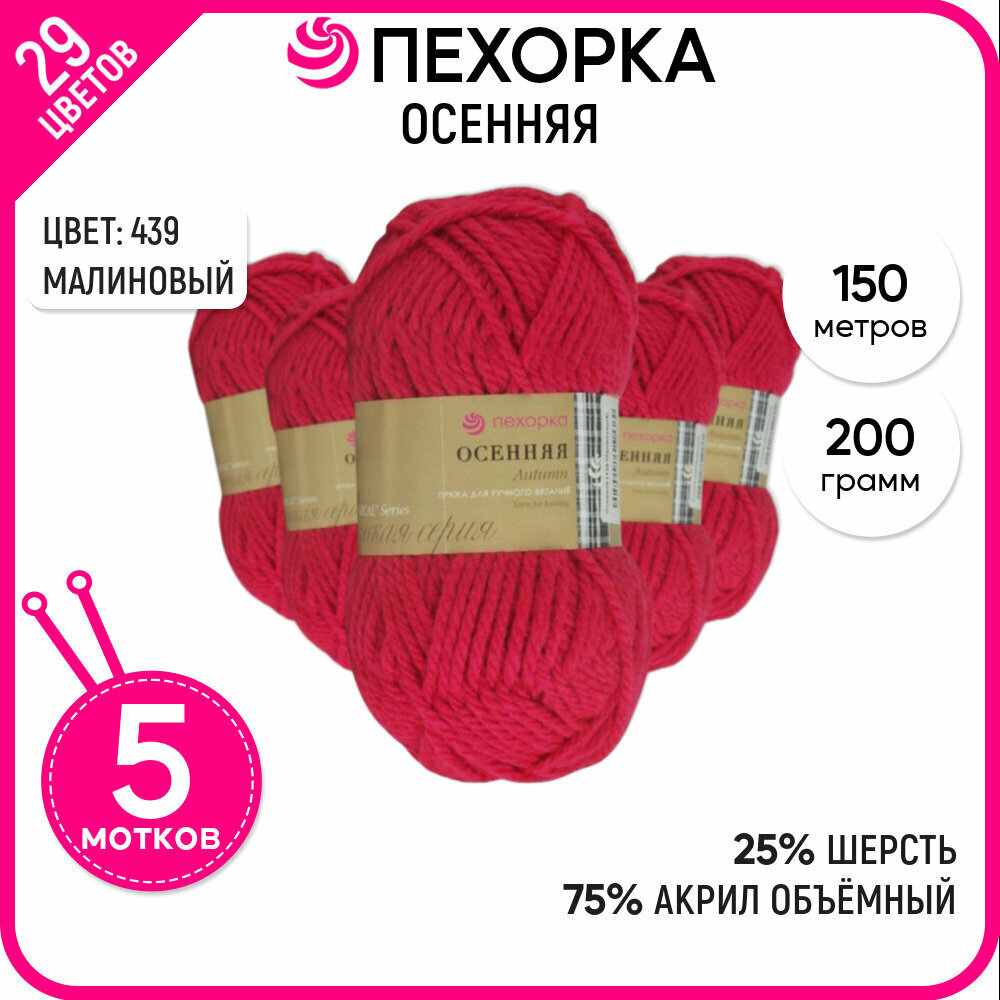 Пряжа Пехорка Осенняя малиновый (439), 25%шерсть/75%акрил, 150м, 200г, 5шт