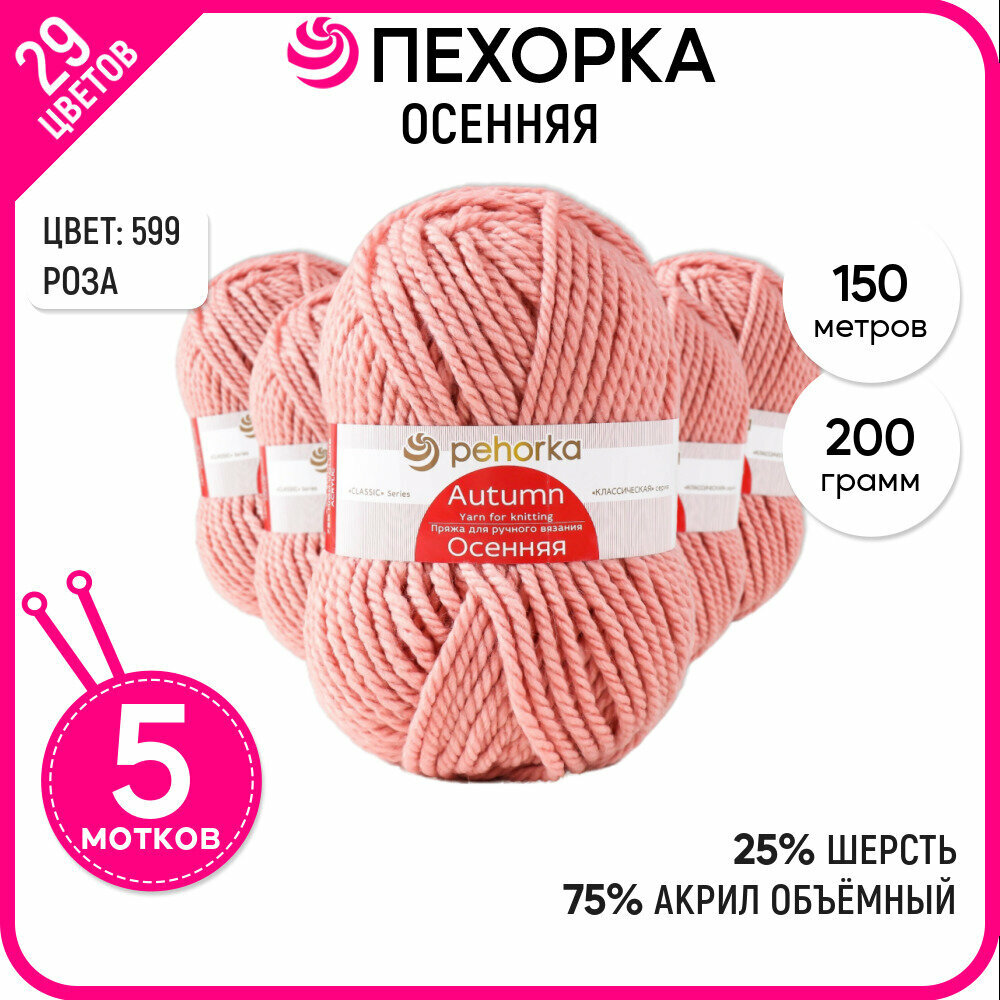 Пряжа для вязания Пехорка 'Осенняя' 200г, 150м (25% шерсть, 75% акрил) (68 чайная роза), 5 мотков