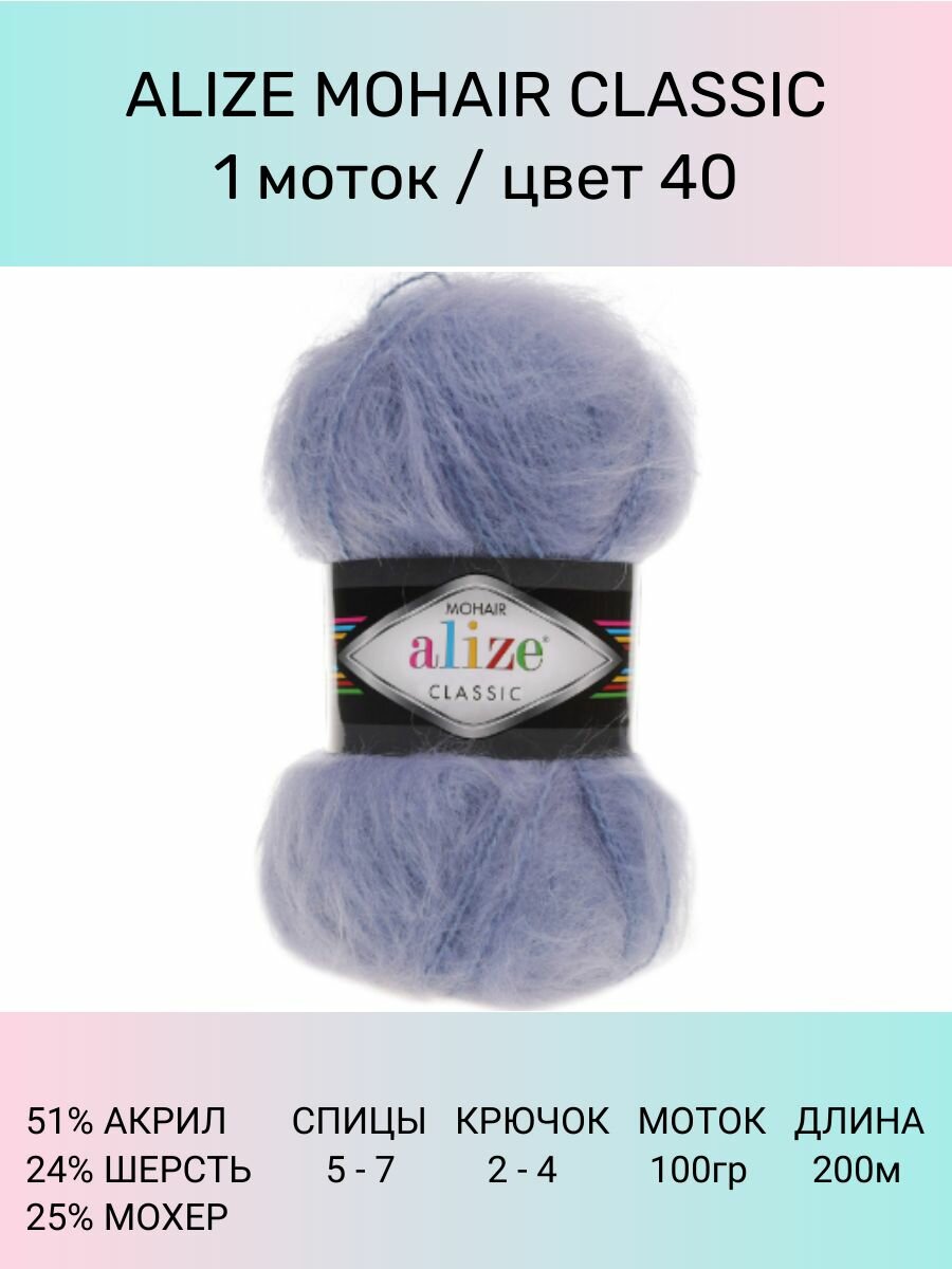 Купить Пряжа Alize Mohair Classic голубой (40), 24%шерсть/25%мохер/51%акрил, 200м, 100г, 1шт