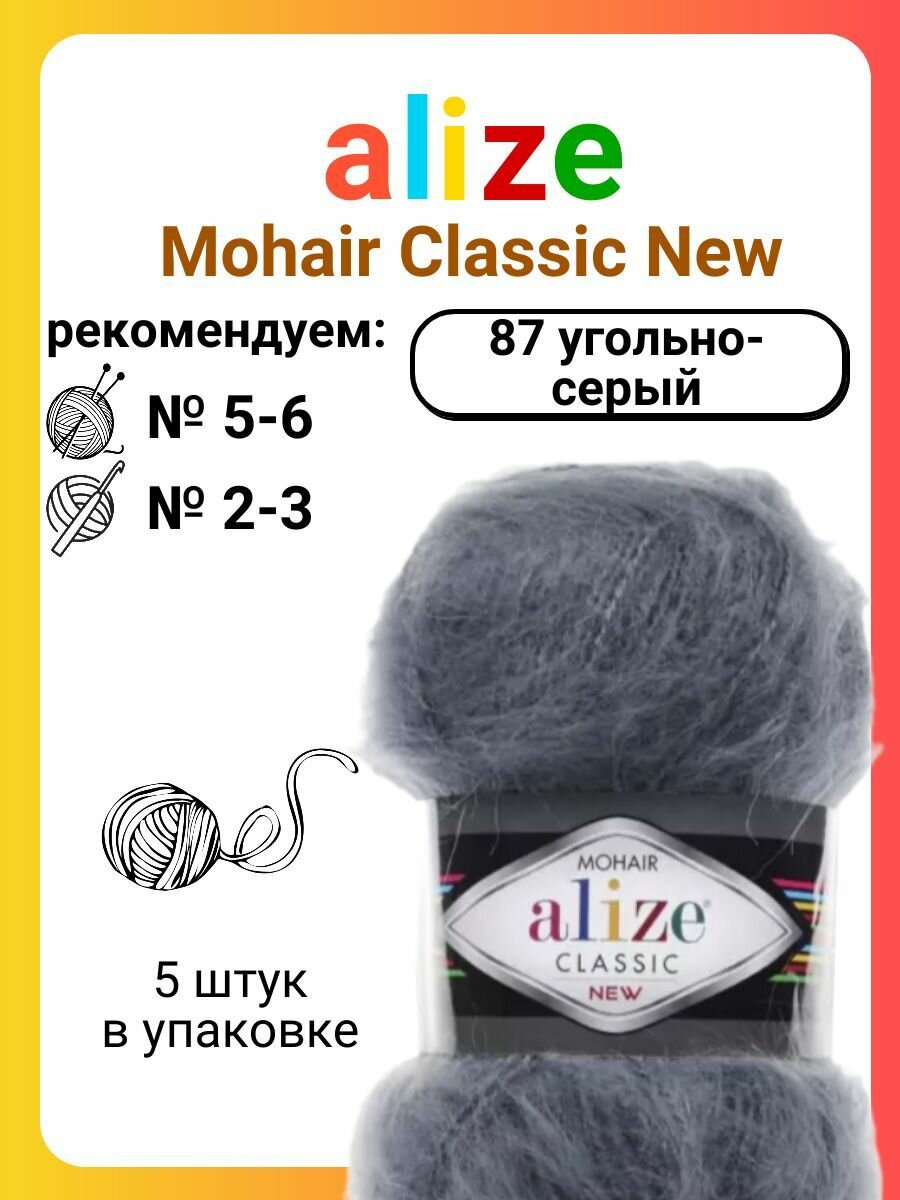 Пряжа для вязания ALIZE Mohair Classic: 87 (угольно-серый), 5 шт 200 м 100 г, 25% мохер 24% шерсть 51% акрил