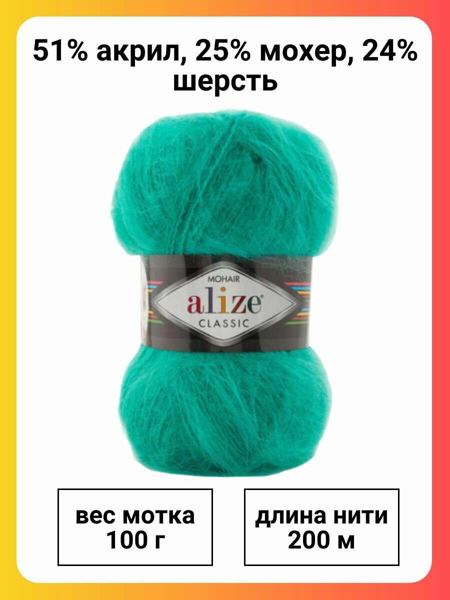 Пряжа Alize Mohair Classic New (Мохер Классик Нью) - 1 шт Цвет: 507 изумруд 25% мохер, 24% шерсть, 51% акрил 100г 200м