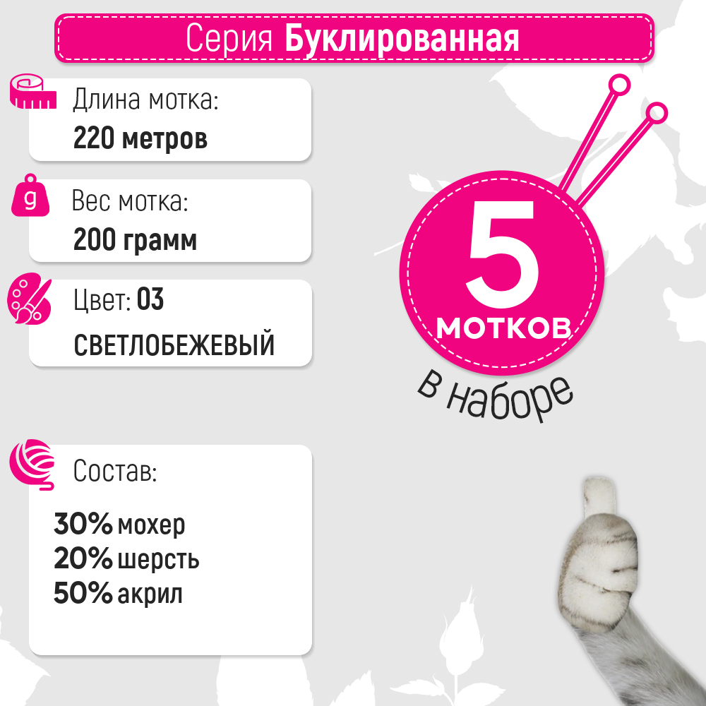 Пряжа Пехорка Буклированная светло бежевый (003), 30%мохер/20%шерсть/50%акрил, 220м, 200г, 5шт