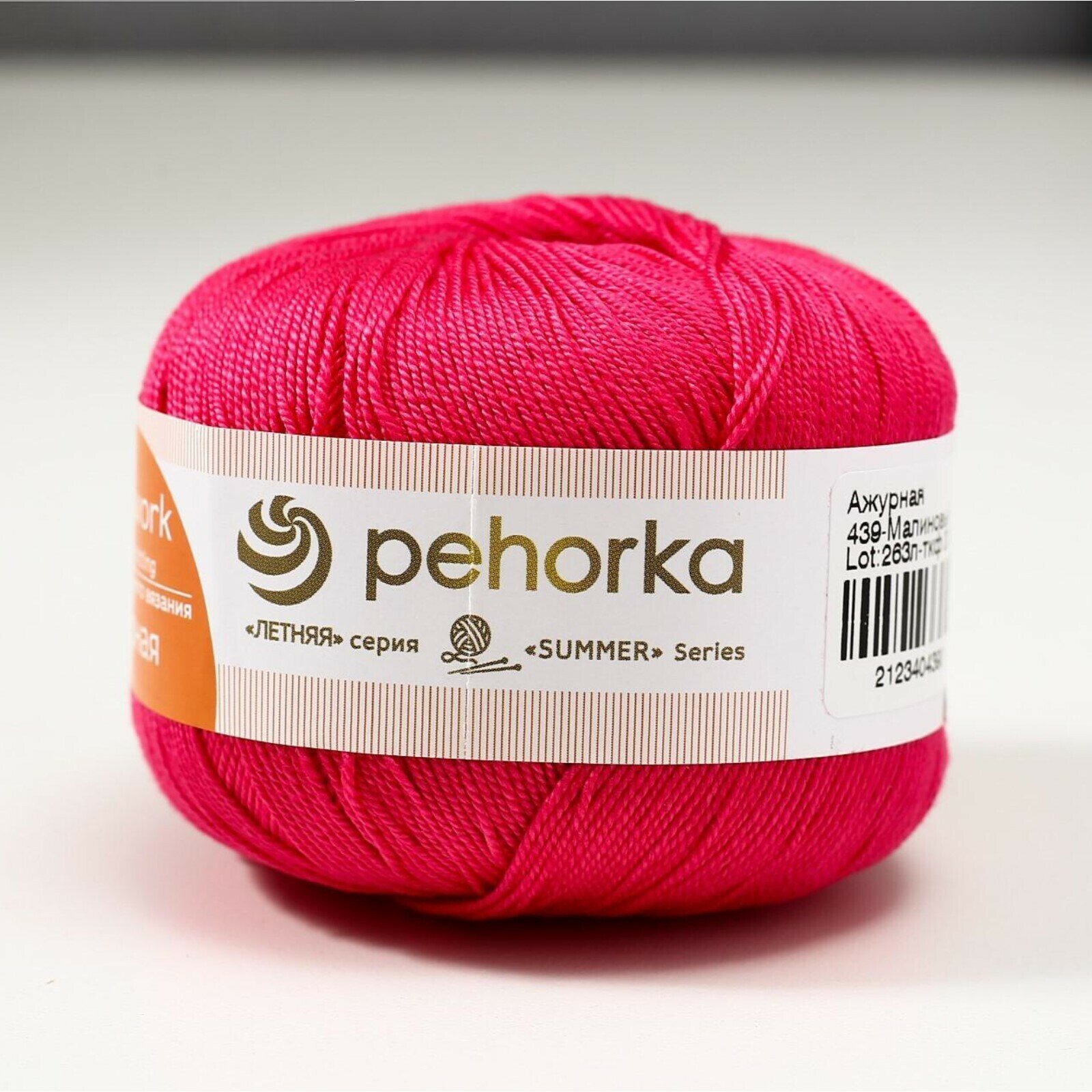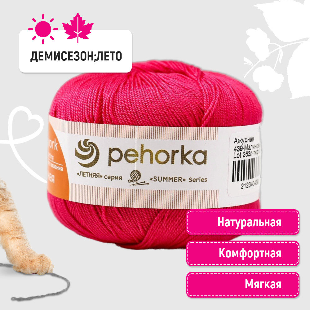 Пряжа Ажурная (Пехорка), Малиновый - 439, 100% мерсеризованный хлопок, 10 мотков, 50 г., 280 м.