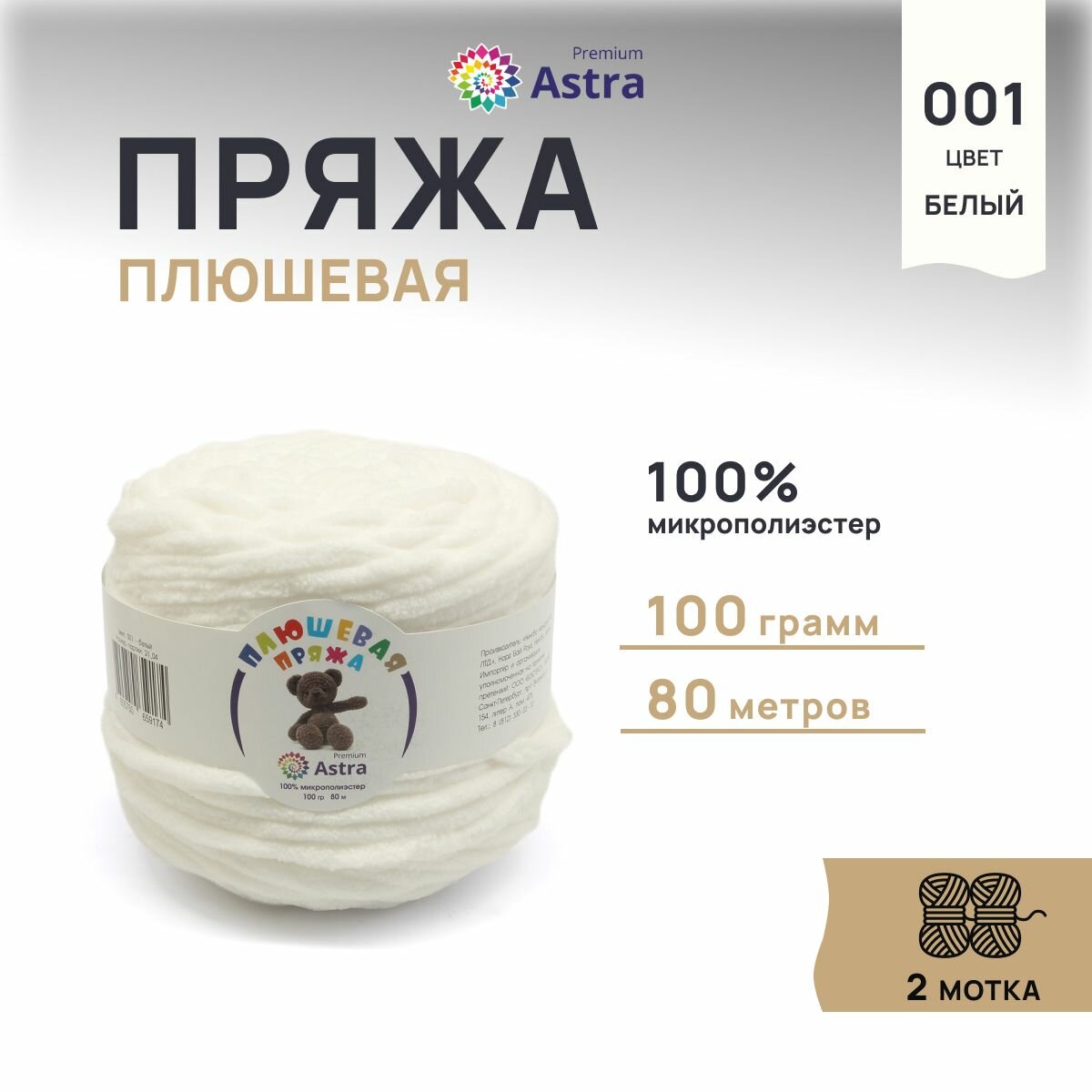 Купить Пряжа для вязания Astra Premium 'Плюшевая', 100г, 80м (100% микрополиэстер) (001 белый), 2 мотка