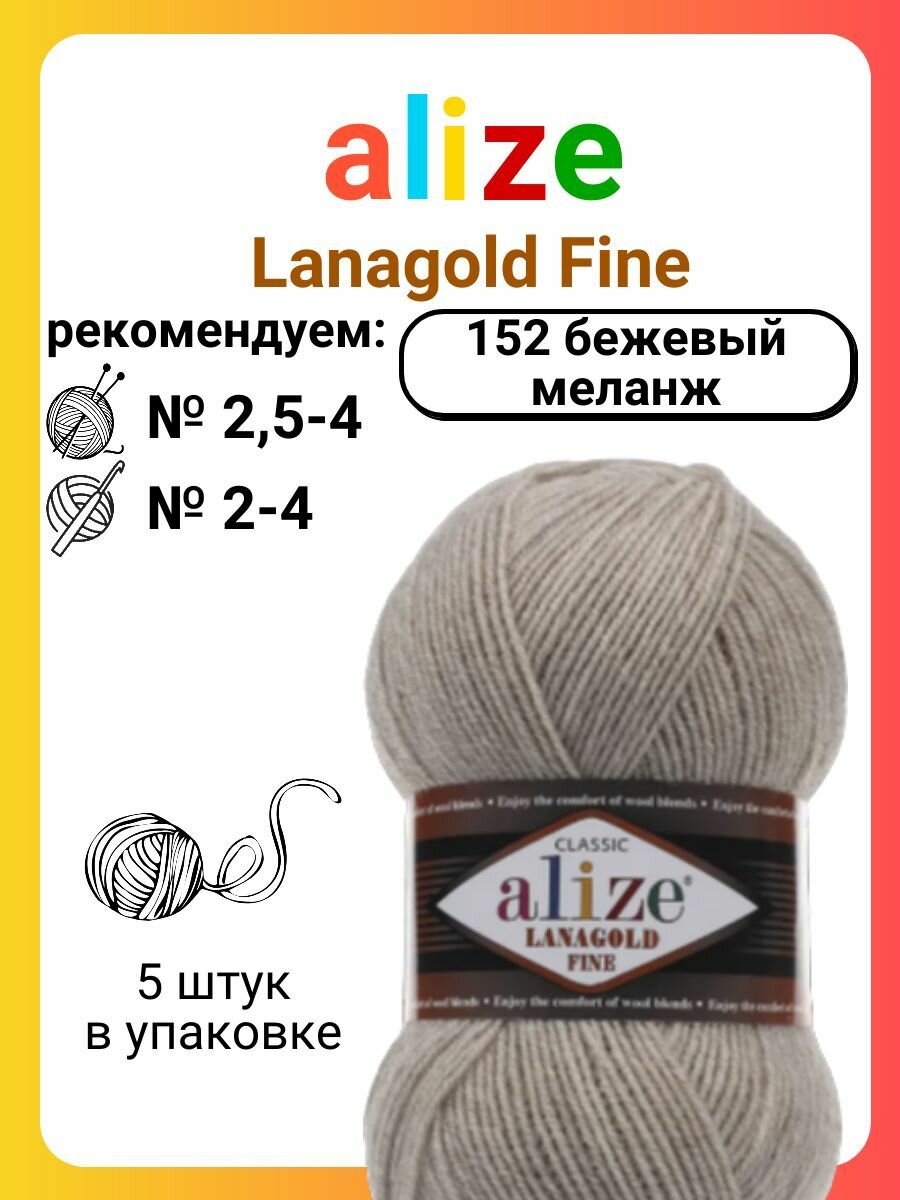 Пряжа для вязания ALIZE LANAGOLD FINE: 5 (бежевый), 5 шт 390 м 100 г, 49% шерсть 51% акрил