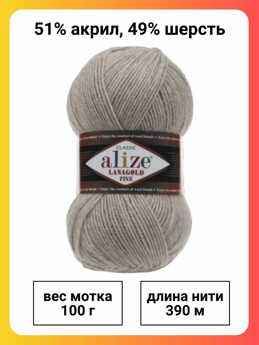 Пряжа ALIZE LANAGOLD FINE, джисовый - 203, 49% шерсть, 51% акрил, 5 мотков, 100 г, 390 м.