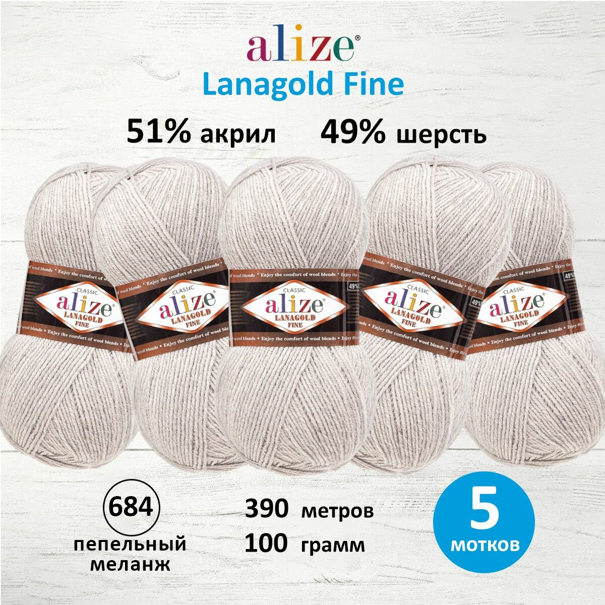 Пряжа Alize Lanagold Fine (Ализе Ланаголд Файн) - 5 мотков, 684 пепельный меланж, 49% шерсть, 51% акрил 390м/100г