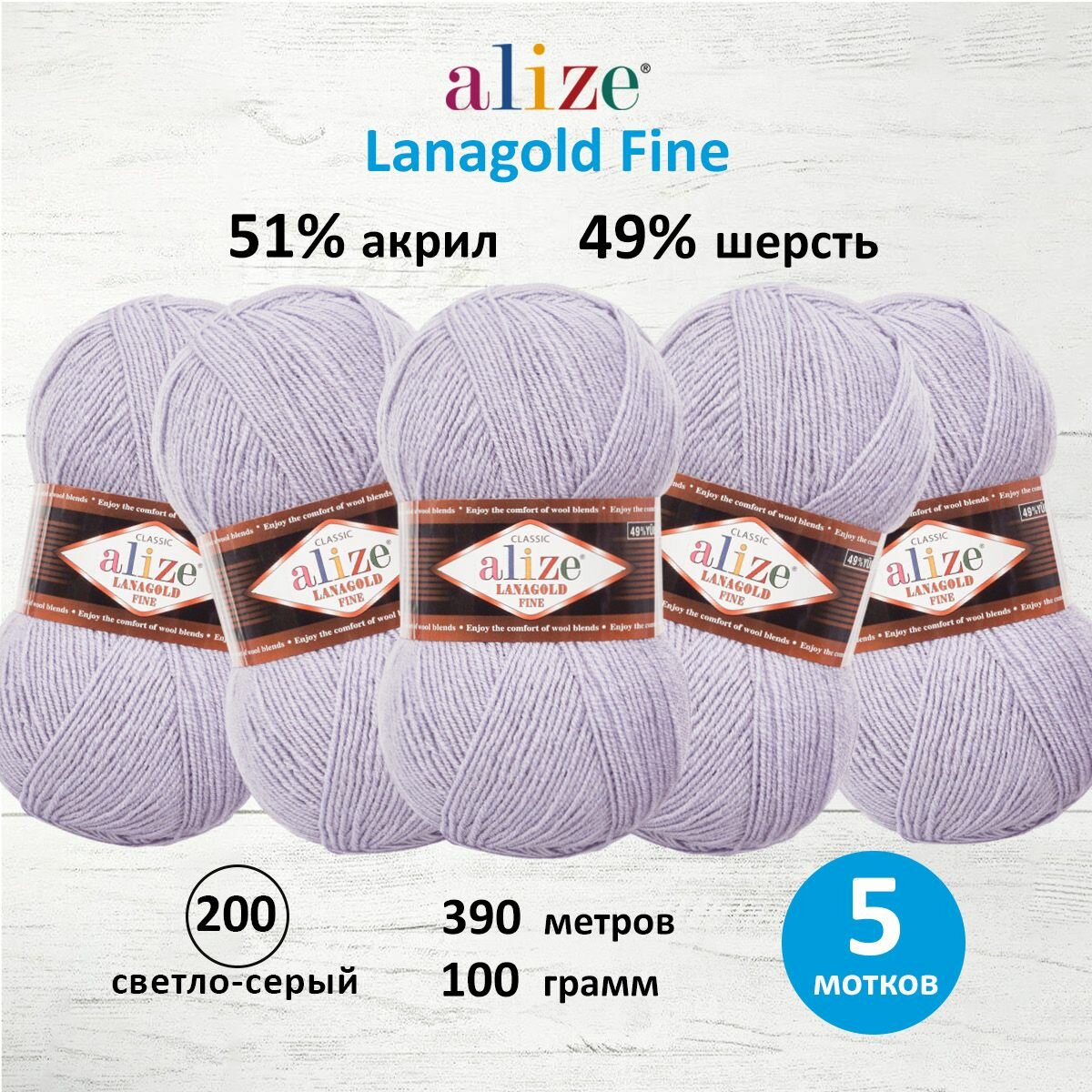 Купить Пряжа Alize Lanagold Fine светло-серый (200), 51%акрил/49%шерсть, 390м, 100г, 5шт