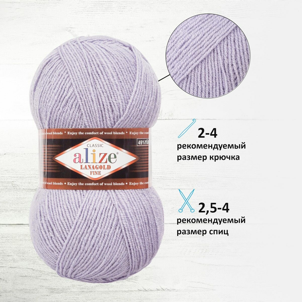Пряжа для вязания ALIZE LANAGOLD FINE: 505 (пепельно-сиреневый), 3 шт 390 м 100 г, 49% шерсть 51% акрил