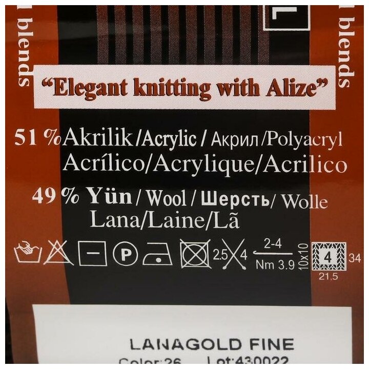 Пряжа Alize Lanagold Fine (Ализе Ланаголд Файн) - 1 моток, 26 коричневый, 49% шерсть, 51% акрил 390м/100г