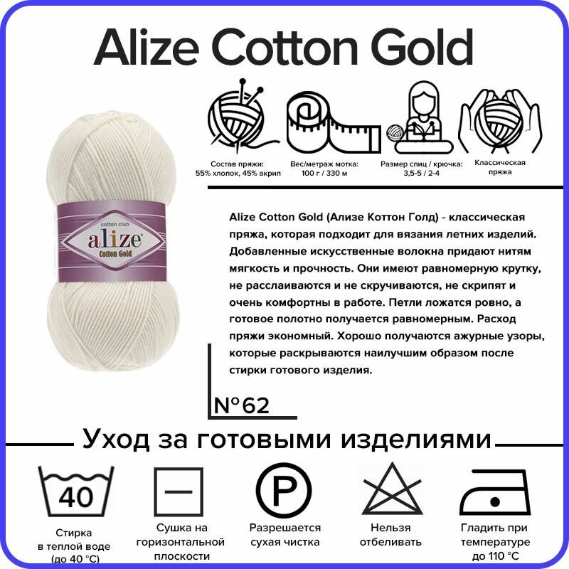 Пряжа Alize Cotton Gold молочный (62), 55%хлопок/45%акрил, 330м, 100г, 1шт