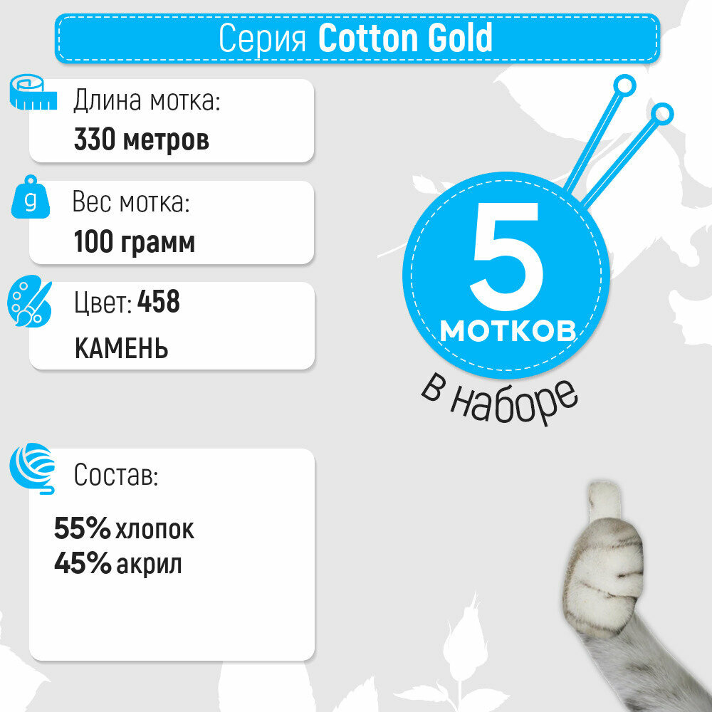 Пряжа Хлопок голд (Cotton gold) упаковка 5 мотков 100 г, 330 м. 55% хлопок 45% акрил цвет 458 камень