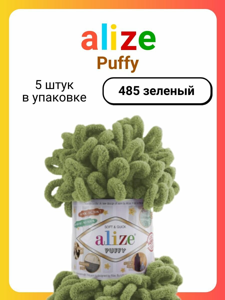 Пряжа плюшевая Alize Puffy (Ализе Пуффи) - 5 мотков 485 зеленый для вязания руками, гипоаллергенная, большие петли (4см), 9м/100г