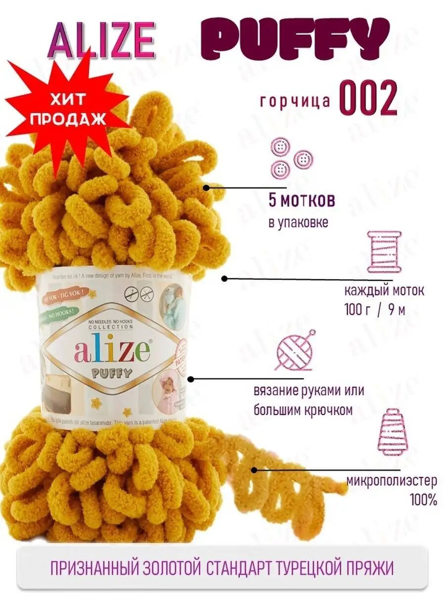 Купить Пряжа Alize Puffy горчичный (02), 100%микрополиэстер, 9м, 100г, 5шт