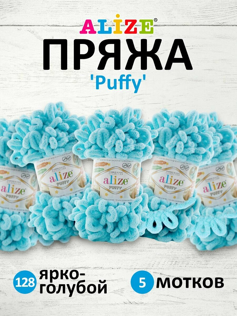 Купить Пряжа для вязания руками с готовыми петлями ALIZE 'Puffy' 100г, 9м (128 ярко-голубой), 5 мотков