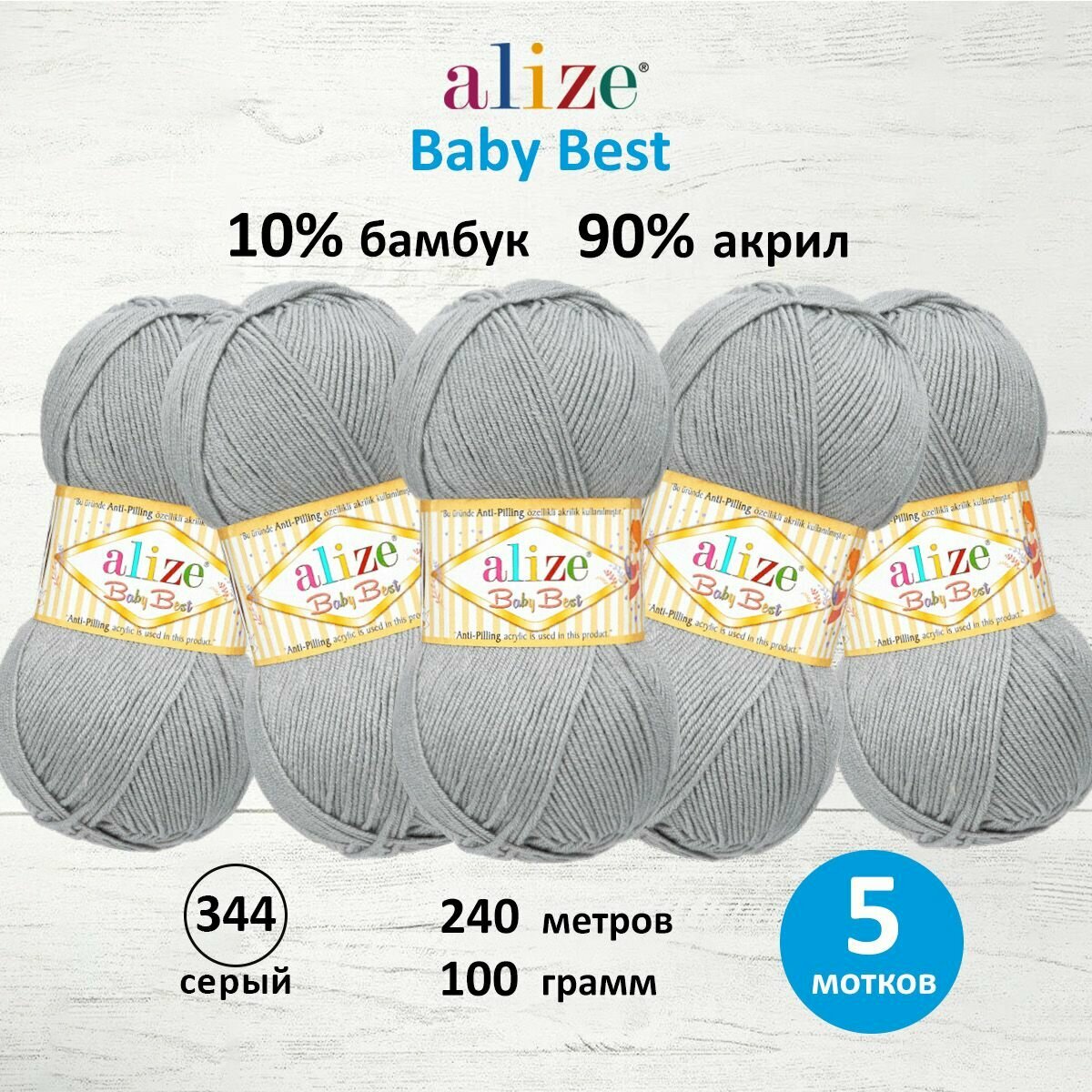 Пряжа BABY BEST (Alize), серый - 344, 10% бамбук, 90% акрил, 5 мотков, 100 г, 240 м.