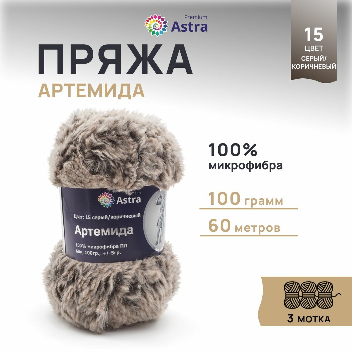 Пряжа Astra Premium "Артемида", 100 гр 60 м, 100% микрофибра ПЛ, 15 серо-коричневый, 3 шт