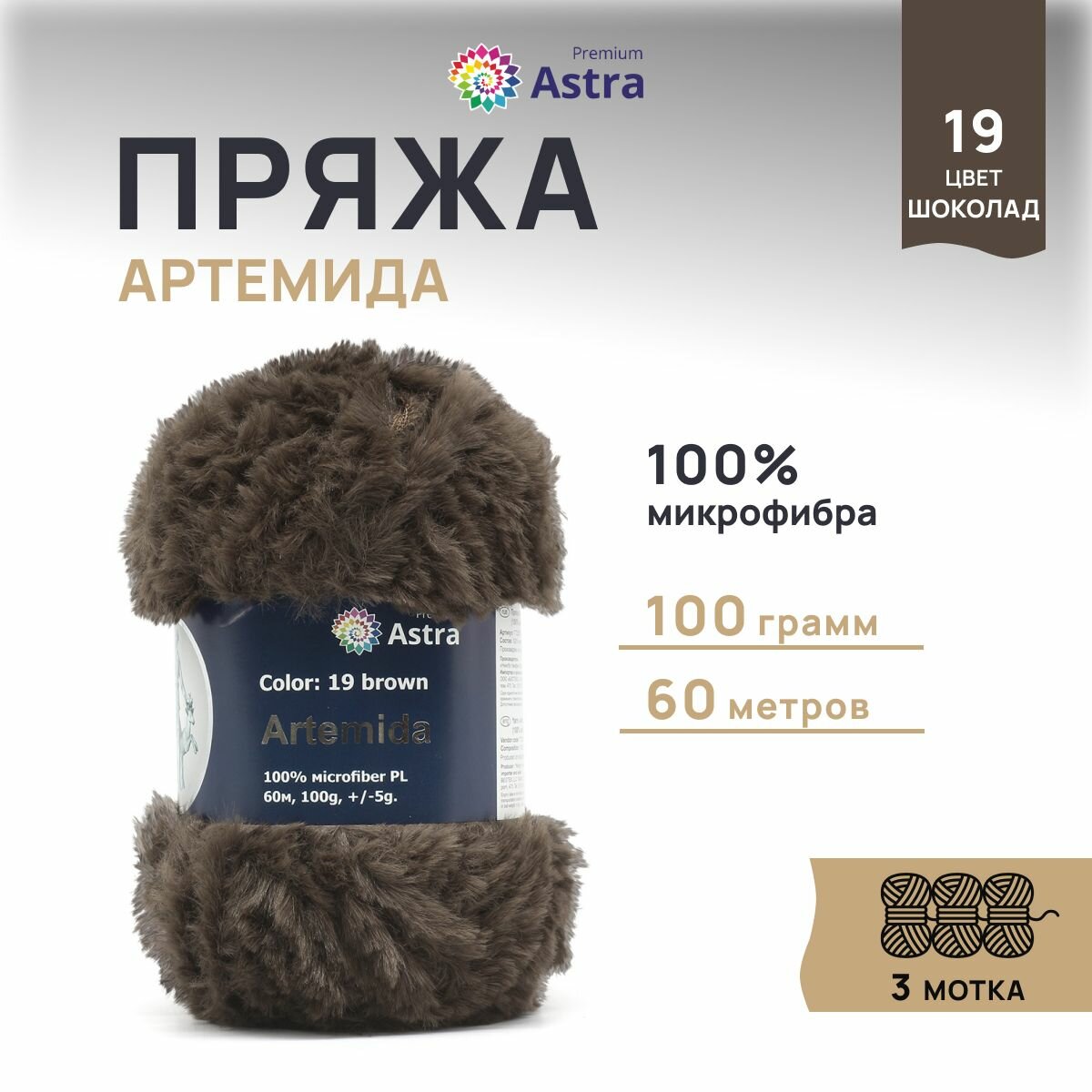 Пряжа Astra Premium "Артемида", 100 гр. 60 м, 100% микрофибра ПЛ, 19 шоколад, 3 шт