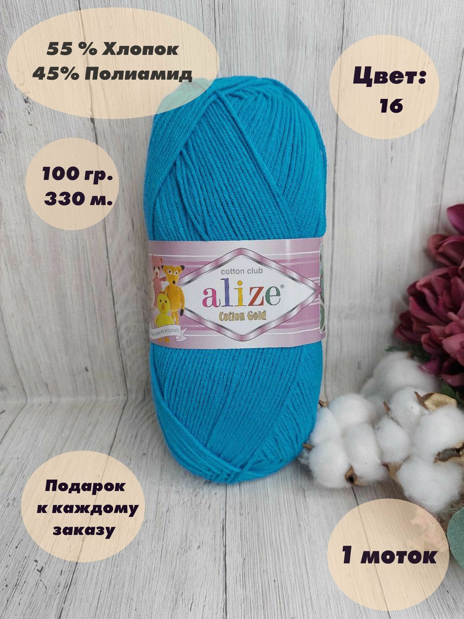 Пряжа Alize Cotton Gold (Коттон Голд) - 1 шт Цвет: 16 бирюзовый 55% хлопок, 45% акрил 100г 330м интересное: