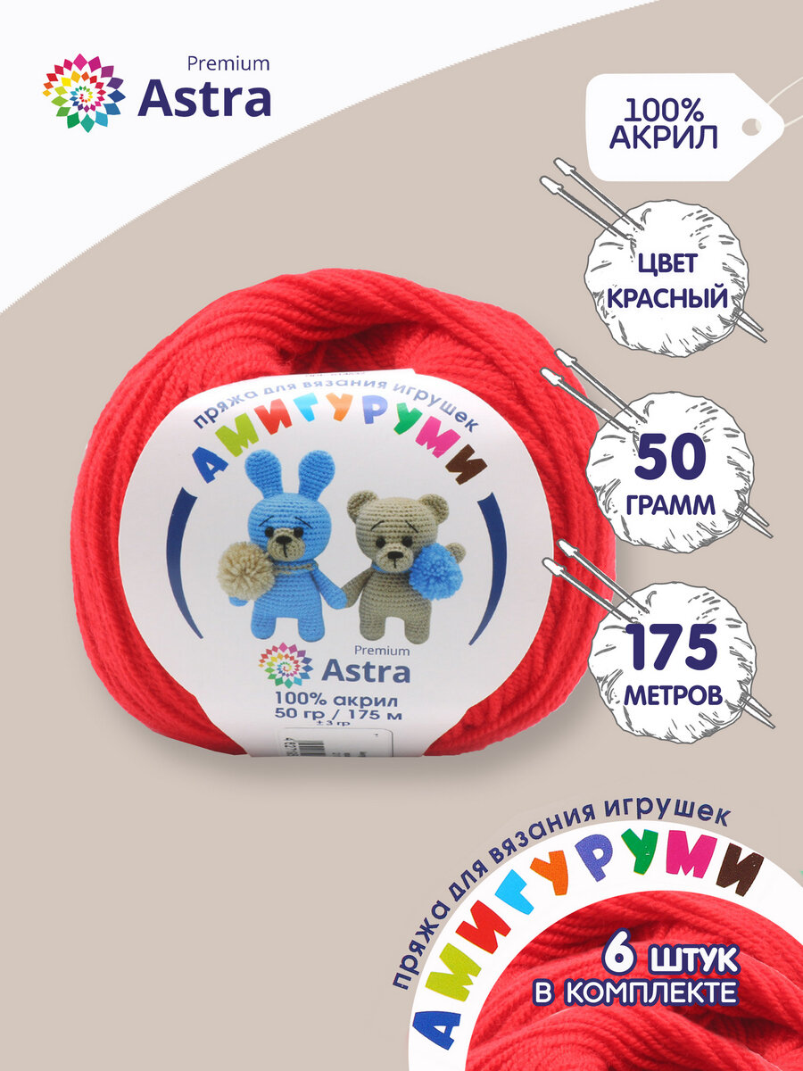 Пряжа Astra Premium "Амигуруми", 50 гр 175 м, 100% акрил, 091 вишня, 6 шт