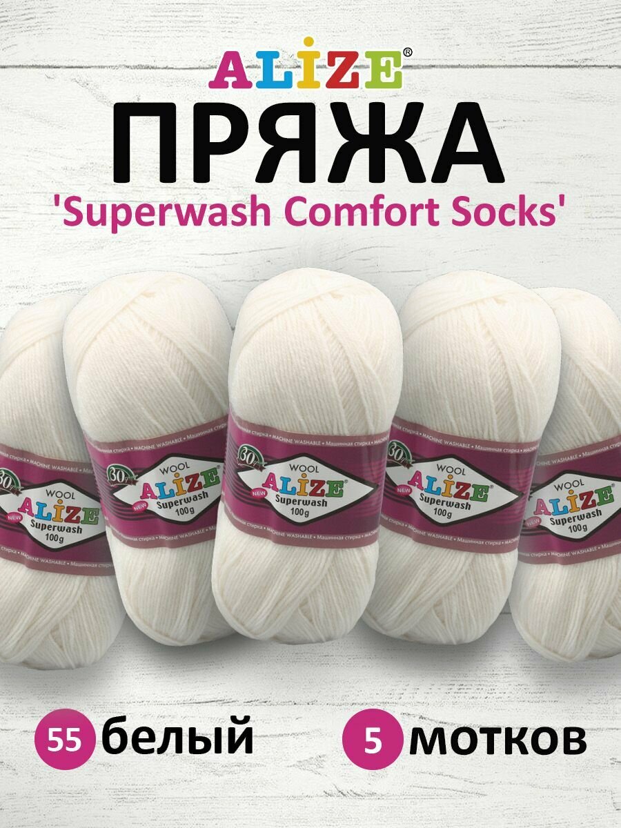 Пряжа для вязания ALIZE 'Superwash Comfort Socks', 100г, 420м (75% SW шерсть, 25% полиамид) (55 белый), 5 мотков