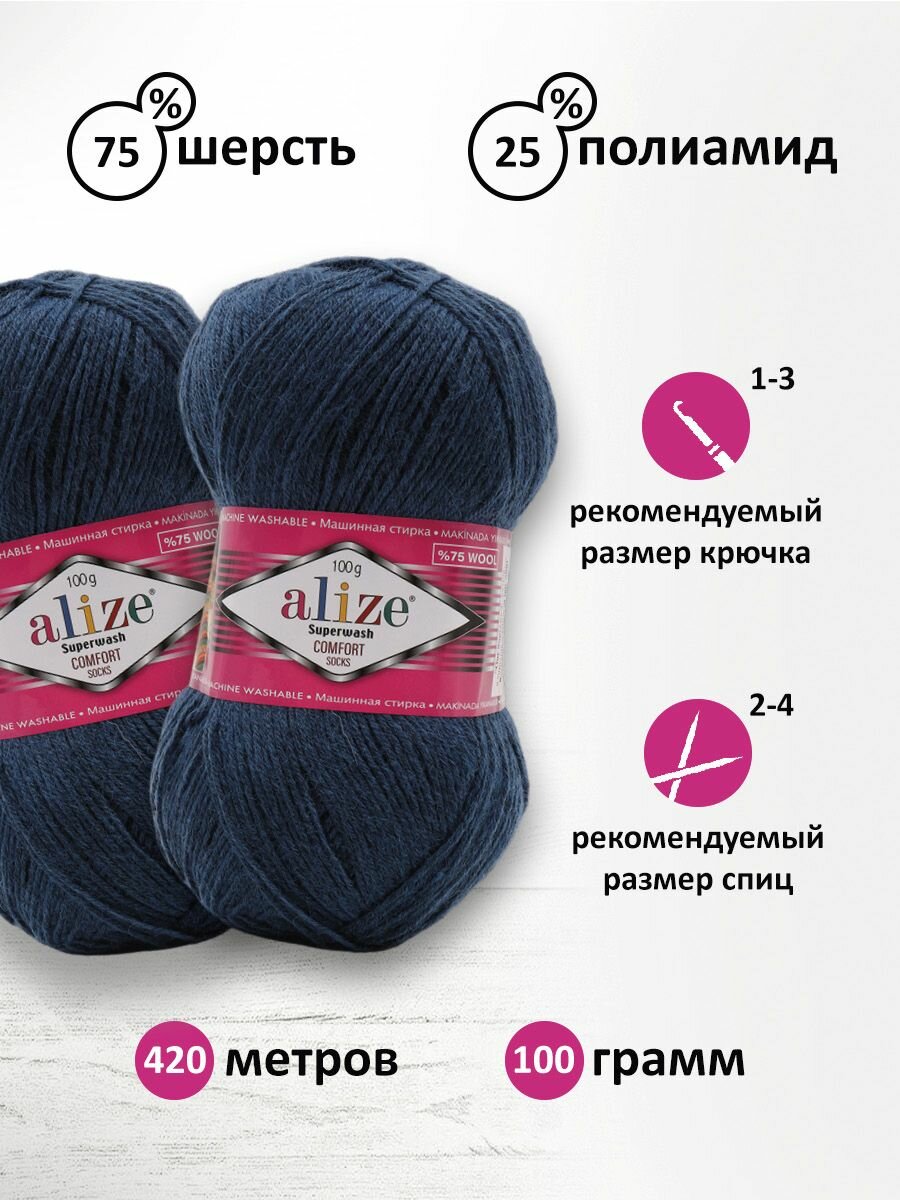 Пряжа Alize Superwash Comfort Socks (Ализе Супервош) - 2 мотка, темно-синий (846), 75% шерсть супервош, 25% полиамид, 420м/100г
