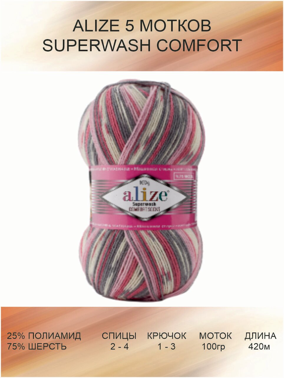 Пряжа ALIZE Superwash Comfort Ализе Супервош: 7840 (серо-оранжевый) / 5 шт / 420 м / 100 г / 75% шерсть, 25% полиамид