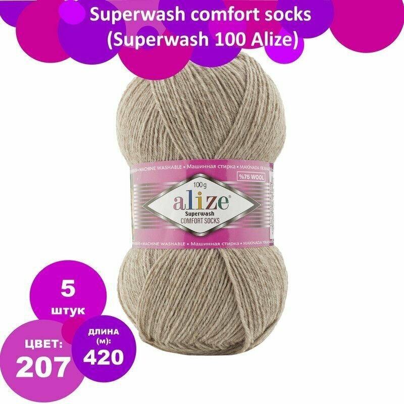 Пряжа для вязания Alize Superwash Comfort Socks, цвет 207 темно-бежевый, 100г, 420м, 5шт/упак