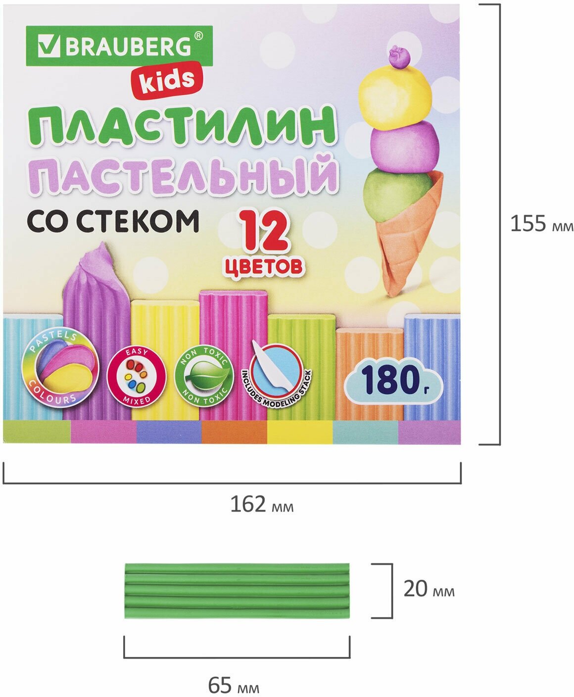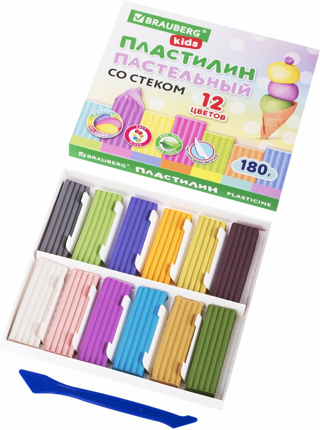 Пластилин BRAUBERG KIDS, мягкий, классический, со стеком, 180 гр, 12 цветов
