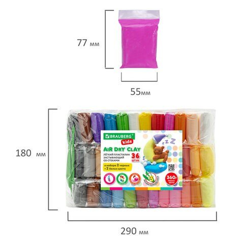 Пластилин Brauberg супер лёгкий воздушный застывающий 36 цветов, 360 г, 3 стека, KIDS, 106308