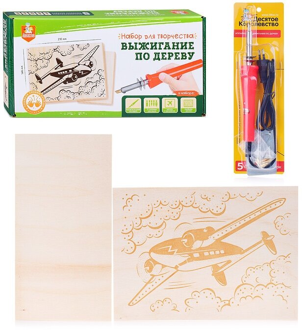 | Подробная комплектация | аппарат для выжигания по дереву (пирограф)— 1 шт. (длина прибора 23 см., длина шнура 90 см.), подставка под аппарат – 1 шт. (5х8 см.), фигурные насадки для нанесения изображений различной сложности — 5 шт. (1,6 см), доска с нанесённым рисунком самолёт - 1 шт. (21х15 см., толщина 3 мм.), доска без рисунка (пробная) – 1 шт. (21х11 см., толщина 3 мм.) |