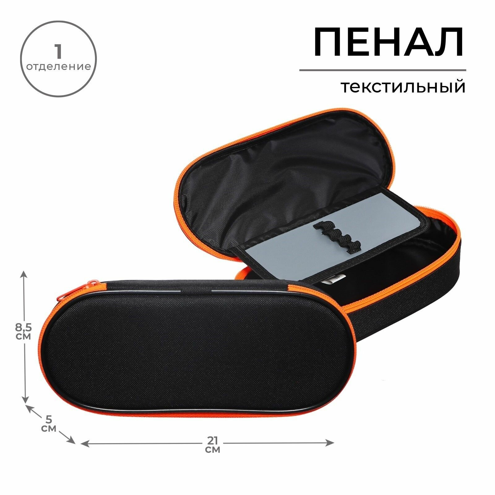 Пенал-футляр 85 х 210 х 50 мм с откидной планкой, мягкий, текстильный, Оникс, ПМК 24-42 Black, чёрный/ярко-оранжевый (арт. 3739309)