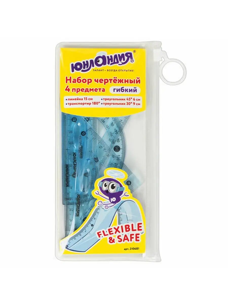 СохранитьНабор чертежный Юнландия малый, гибкий "Flex", (линейка 15 см, 2 треугольника, транспортир) интересное: