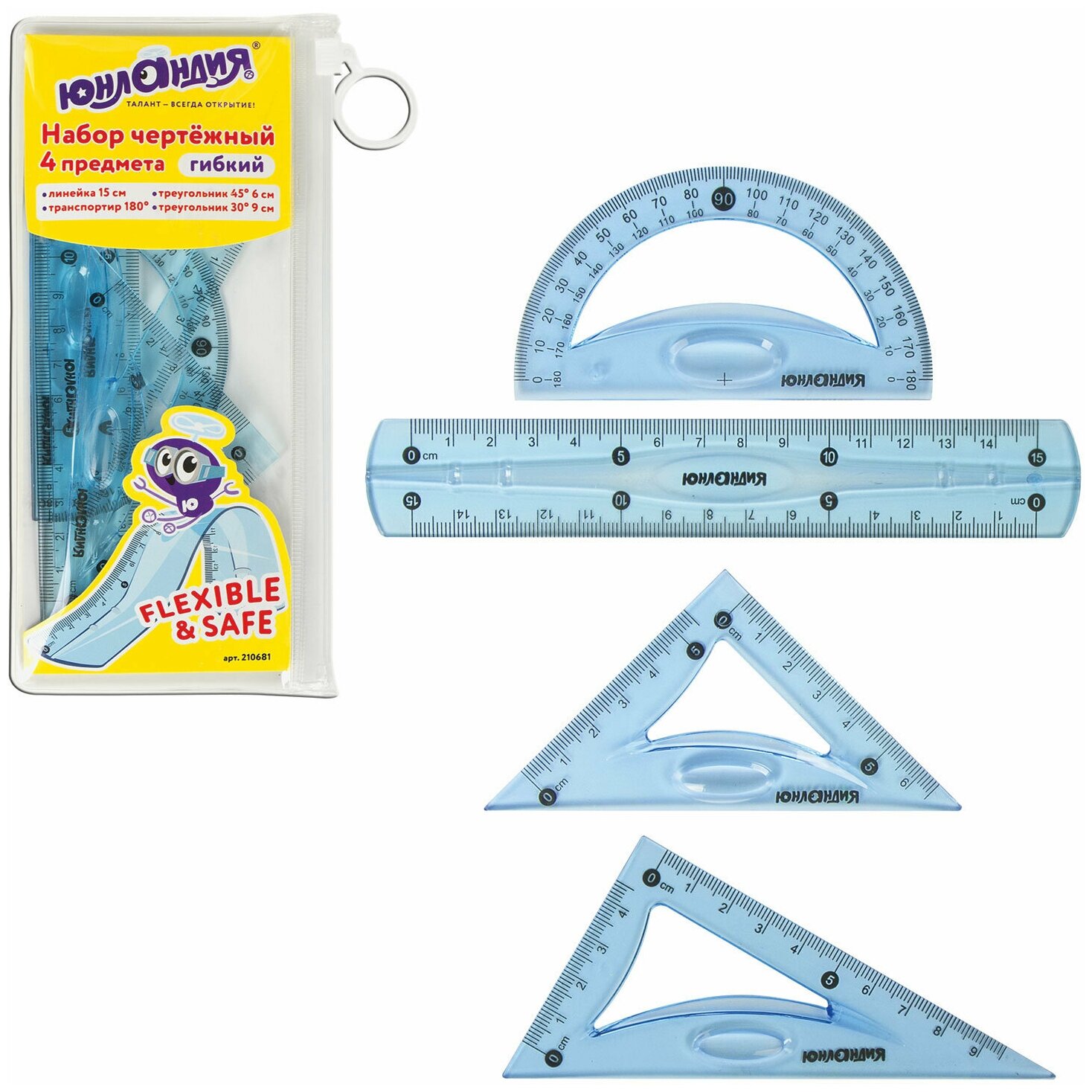 Набор чертежный малый гибкий юнландия "FLEX" (линейка 15 см, 2 треугольника, транспортир), пенал, 210681