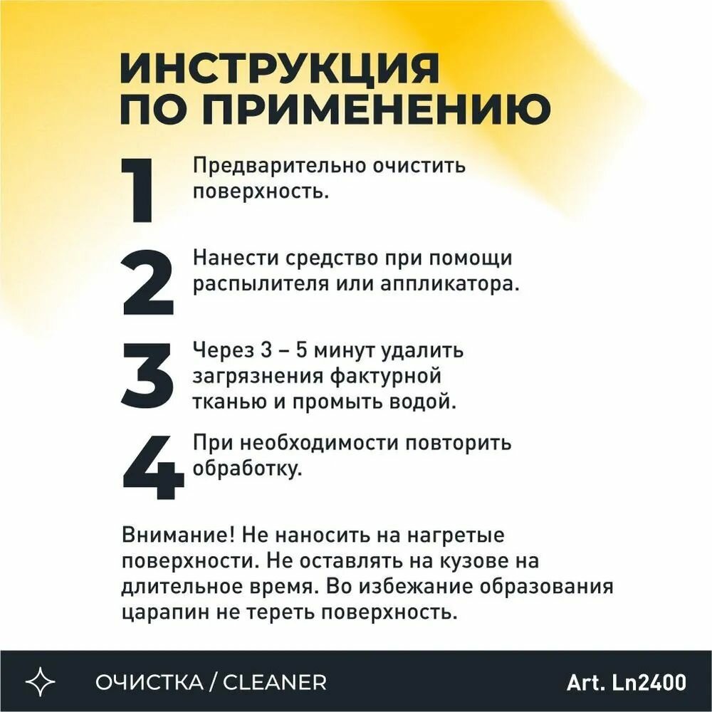 | Способ применения | Предварительно очистить поверхность. Нанести средство при помощи распылителя или аппликатора. Через 3 – 5 минут удалить загрязнения фактурной тканью и промыть водой. При необходимости повторить обработку. Внимание! Не наносить на нагретые поверхности. Не оставлять на кузове на длительное время. Во избежание образования царапин не тереть поверхность. |