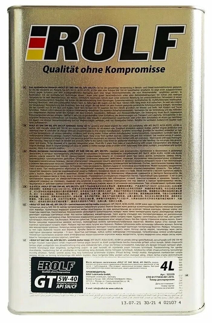 Gt 5W40 масло моторное синт. (акция 4+1л.) Sn/Cf Rolf 322405 интересное: