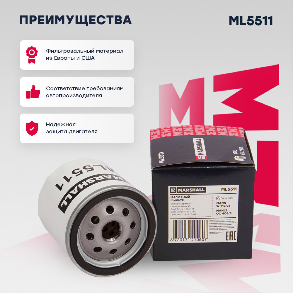 Купить Фильтр масляный MARSHALL ML5511 для Daewoo Espero, Daewoo Nexia, Opel Astra, Opel Corsa, Opel Vectra // кросс-номер MANN W 712/75