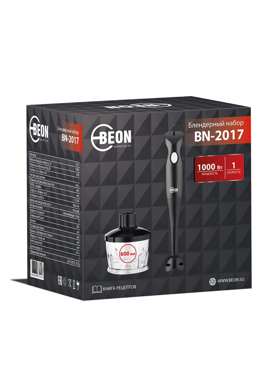Блендер погружной BEON BN-2017, 2в1, 1000Вт, 1 скорость, измельчитель 600мл, погружная часть пластик, книга рецептов интересное: