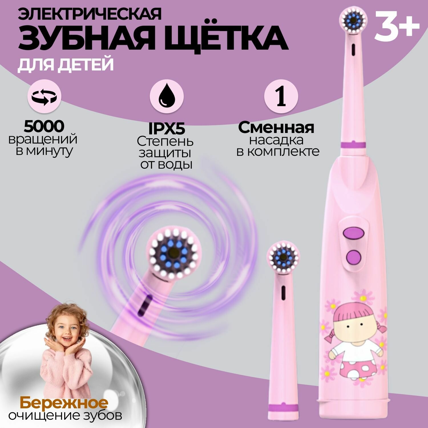 Электрическая зубная щетка детская Biksi с 2 насадками, от 2 батареек АА, розовый интересное: