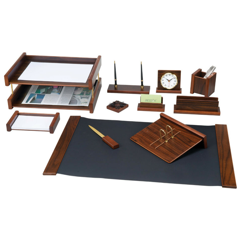 | В комплекте | двойной лоток для бумаг, коврик для письма, подставка для ручек (2 шариковые ручки в комплекте), стакан-подставка для письменных принадлежностей, подставка для бумажного блока, подставка для визиток, нож для вскрытия конвертов, подставка для писем, скрепочница магнитная, подставка для перекидного календаря, часы |