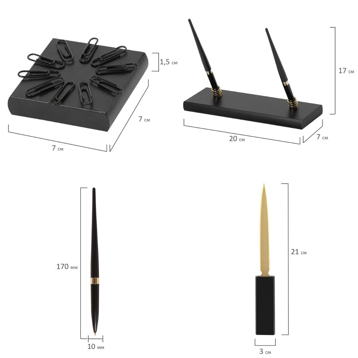 | В комплекте | двойной лоток для бумаг, коврик для письма, подставка для ручек (2 шариковые ручки в комплекте), стакан-подставка для письменных принадлежностей, подставка для бумажного блока, подставка для визиток, нож для вскрытия конвертов, подставка для писем, скрепочница магнитная, подставка для перекидного календаря, часы |