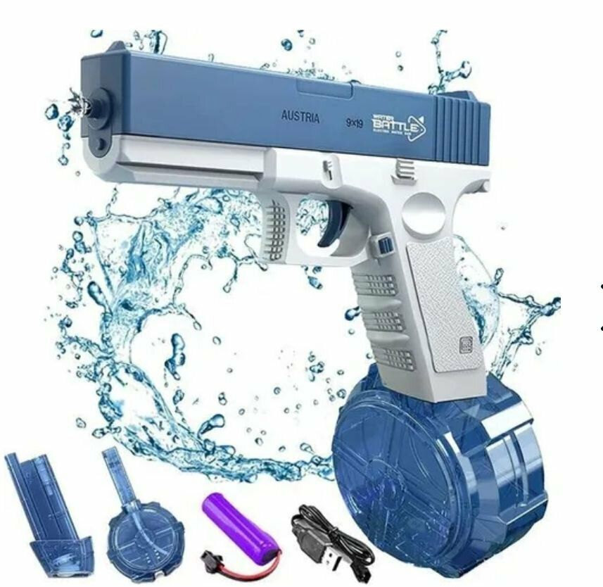 Водный электрический пистолет, автоматическая стрельба, дальность 5-8 метров, увеличенная обойма + 1 обычная обойма в комплекте, работа от аккумулятора.
