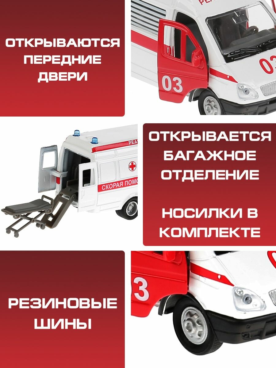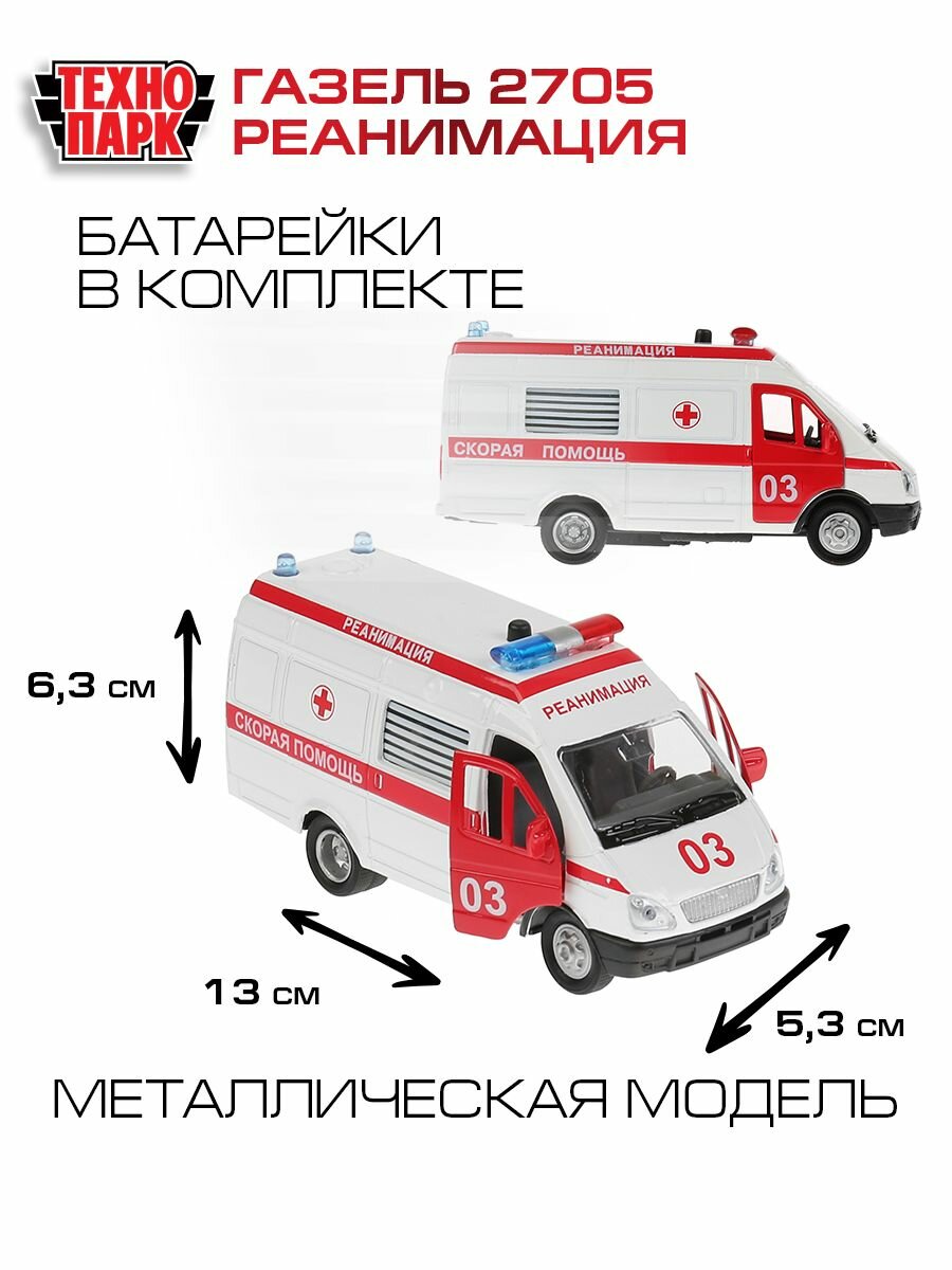 Машинка детская Газель 2705 Скорая Реанимация 13 см, Технопарк, металл, открываются двери, свет и звук